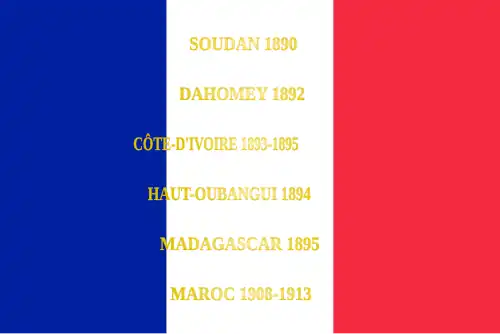 Soudan 1890 Dahomey 1892 Côte-d'Ivoire 1893-1895 Haut-Oubangui 1894 Madagascar 1895 Maroc 1908-1913 |