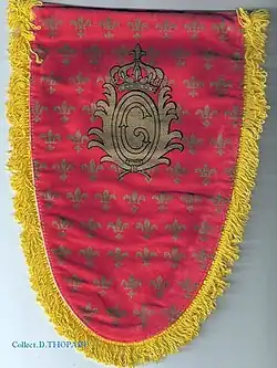 Il porte, cousues en lettres d'or dans ses plis, les inscriptions suivantes[5] :