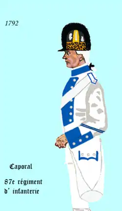 1791 : tous les régiments prennent un nom composé du nom de leur arme avec un numéro d’ordre donné selon leur ancienneté. le régiment de Dillon devient le 87e régiment d'infanterie de ligne ci-devant Dillon.
