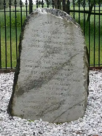 En 1883, un monument en marbre du Vermont est placé sur le site où le 8th Vermont a tenu sa position. Le monument est financé par Herbert E. Hill, un homme d'affaires du Vermont qui veut faire honneur aux héros de la guerre de Sécession de son État. Le monument est situé sur son lieu d'origine sur le champ de bataille à environ 150 mètres à l'est de la Valley Pike, maintenant l'U.S. Route 11 entre Middletown et Strasburg, en Virginie. Le monument est bien maintenu par une propriété privée récente. En 2012, la propriété est acquise par le parc historique national de Cedar Creek et Belle Grove, qui fournit l'accès aux visiteurs, même si actuellement cela se fait seulement par le biais de programmes dirigés par les rangers[6].