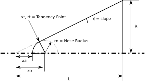 Dans toutes les équations de pointe avant qui vont suivre, L est la longueur totale de la pointe et R est le rayon de la base de la pointe. y est le rayon en tout point x, comme X varie de 0, au bout de la pointe jusqu'à L. Les équations définissent le profil de bidimensionnel de la forme de la pointe avant. La surface de révolution de la pointe est formée par la rotation du profil autour de l'axe (C / L).
