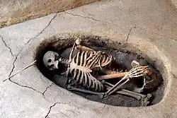 Les différentes campagnes de fouilles ont permis d'exhumer 70 corps enterrés sous certaines des 400 structures fouillées. Ils étaient placés dans des fosses creusées dans le sol sous les planchers des bâtiments alors que les maisons étaient encore utilisées.