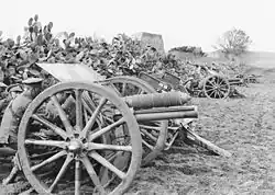 - ↑ The basic organic unit of the Royal Artillery was, and is, the Battery[5]. When grouped together they formed brigades, in the same way that infantry battalions or cavalry regiments were grouped together in brigades. At the outbreak of the First World War, a field artillery brigade of headquarters (4 officers, 37 other ranks), three batteries (5 and 193 each), and a brigade ammunition column (4 and 154)[6] had a total strength just under 800 so was broadly comparable to an infantry battalion (just over 1,000) or a cavalry regiment (about 550). Like an infantry battalion, an artillery brigade was usually commanded by a Lieutenant-Colonel. Artillery brigades were redesignated as regiments in 1938. Note that the battery strength refers to a battery of six guns; a four-gun battery would be about two thirds of this.