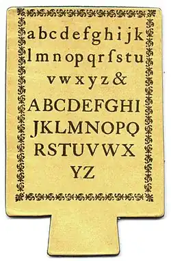 Les premiers abécédaires imprimés utilisaient l'écriture gothique. Comme l'écriture latine n'a été introduite en Angleterre qu'en 1467, et a connu son sommet vers 1580, les hornbooks dans cette écriture ne peuvent dater que du XVe siècle ou après, mais pas avant. Les imprimeries continuèrent à utiliser leurs caractères jusqu'aux XVIe et XVIIe siècles, après l'introduction de l'écriture latine, si bien que l'on ne peut pas dater avec certitude la date de fabrication d'un abécédaire à partir de la seule écriture. Les derniers hornbooks et battledores fabriqués au XIXe siècle utilisaient des polices de type Bodoni.