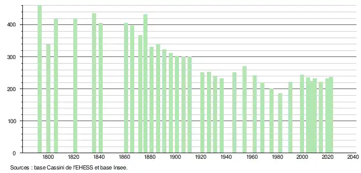 L'évolution du nombre d'habitants est connue à travers les recensements de la population effectués dans la commune depuis 1793. Pour les communes de moins de 10 000 habitants, une enquête de recensement portant sur toute la population est réalisée tous les cinq ans, les populations de référence des années intermédiaires étant quant à elles estimées par interpolation ou extrapolation[21]. Pour la commune, le premier recensement exhaustif entrant dans le cadre du nouveau dispositif a été réalisé en 2004[22].