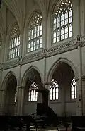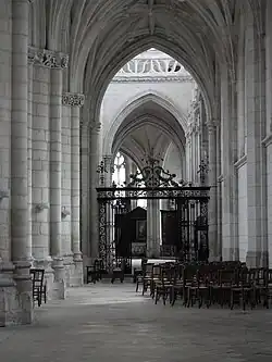 Il est séparé de la nef par une grille du XVIIe siècle exécutée sous l’abbatiat de Charles d’Aligre. Les voûtes d’ogives sont à liernes et tiercerons avec clefs sculptées de feuillage. Le cordon au-dessus des arcades est composé d’une guirlande de rose de Provins. La balustrade posée sur un larmier décoré de minuscules têtes d’hommes et d’animaux est de style flamboyant.
