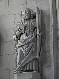 Deux statues majestueuses encadrent l’entrée principale sous la tribune d’orgue : saint Christophe traversant un torrent d’un côté et saint Jacques le Majeur de l’autre.
