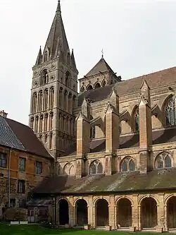 La première église est consacrée le en présence du nouveau roi d’Angleterre, Guillaume, duc de Normandie, neveu de la comtesse qui avait placé son établissement sous sa haute protection. Brûlée en 1106, elle est reconstruite, puis quasiment achevée sous l’abbatiat de l’abbé Haimon à la fin de la première moitié du XIIe siècle.