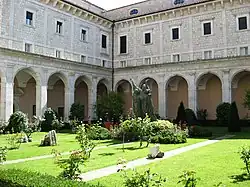 Le cloître fut construit en 1595 dans un style Renaissance au centre de l’abbaye, comme c'est l'usage. Au centre du cloître, il y a une citerne octogonale, flanquée de colonnes corinthiennes qui soutiennent l'entablement. Au pied de l'escalier, il y a deux statues de Pier Paolo Campi (en) : à gauche saint Benoît, pièce originale de 1736, et à droite une copie d’une statue de sainte Scholastique, avec les inscriptions « Béni est celui qui vient au nom du Seigneur » et « Viens, ma colombe, viens, tu seras couronnée ». La loggia surplombant la vallée de la Liri s'appelle Paradis.