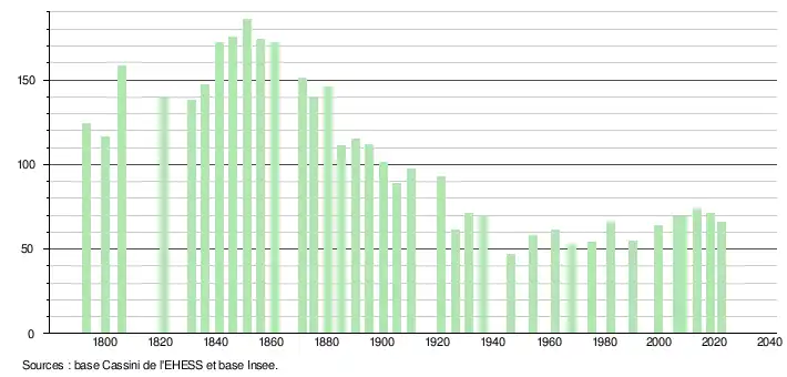 L'évolution du nombre d'habitants est connue à travers les recensements de la population effectués dans la commune depuis 1793. Pour les communes de moins de 10 000 habitants, une enquête de recensement portant sur toute la population est réalisée tous les cinq ans, les populations de référence des années intermédiaires étant quant à elles estimées par interpolation ou extrapolation[20]. Pour la commune, le premier recensement exhaustif entrant dans le cadre du nouveau dispositif a été réalisé en 2008[21].