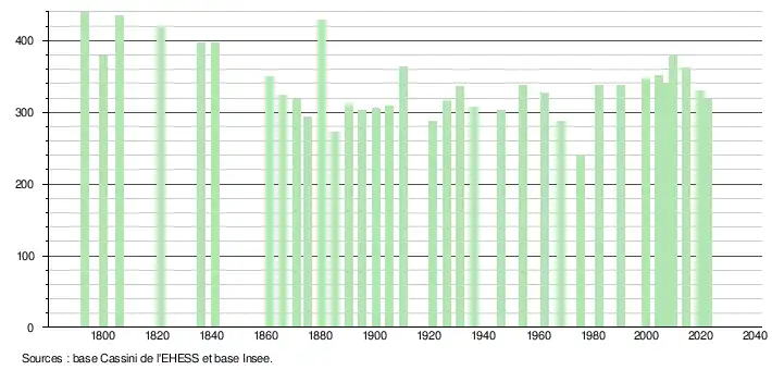 L'évolution du nombre d'habitants est connue à travers les recensements de la population effectués dans la commune depuis 1793. Pour les communes de moins de 10 000 habitants, une enquête de recensement portant sur toute la population est réalisée tous les cinq ans, les populations de référence des années intermédiaires étant quant à elles estimées par interpolation ou extrapolation[25]. Pour la commune, le premier recensement exhaustif entrant dans le cadre du nouveau dispositif a été réalisé en 2004[26].