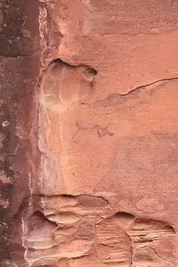 À l'extrémité gauche de l'abri, une figure humaine très stylisée a été peinte, probablement féminine, de couleur brun rougeâtre.