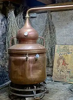 - Mettre dans l'alambic, 15 litres d'alcool pur à 95°, 25 litres d'eau et ajouter la blanquette de la cuite précédente (1 litre environ). 3 poignées de grande et 1 poignée de petite absinthe, 2 kg d'anis, 1 kg de fenouil, 1 poignée d'hysope, 1 poignée de mélisse, 1 poignée de menthe.