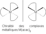 L'anion acétylacétonate forme des complexes avec de nombreux ions de métaux de transition dans lesquels les deux atomes d'oxygène se lient au métal pour former un anneau de chélation à six membres. On peut citer parmi ces complexes : Mn(acac)3[8], le VO(acac)2, Fe(acac)3, et Co(acac)3. Tout complexe de la forme M(acac)3 est chiral (ils ne sont pas superposables à leurs images dans un miroir), comme indiqué sur la figure 2.