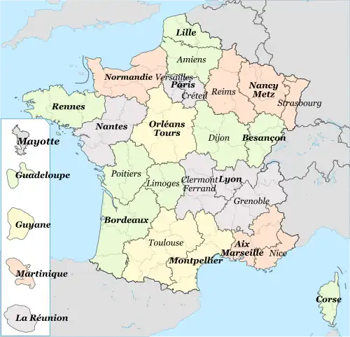 - ↑ Le rectorat a son siège dans la ville dont l'académie porte le nom. Pour les académies à double-nom. Le nom vient la plupart du temps de la ville où se trouvait l'université. Pour l'outre-mer, le nom de l'académie est le même que celui de la région de son ressort et le siège est généralement celui de la préfecture (ou d'une commune de l'agglomération de celle-ci, comme Schœlcher pour la Martinique).