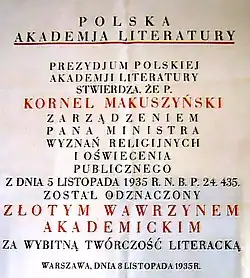 Après la mort de Choynowski (1935) et Leśmian (1937) et la démission de Rzymowski accusé de plagiat (1937)[10], puis de Rostworowski (1937) en signe de protestation contre le changement de gouvernement[11], la composition de l'Académie a été complétée par les écrivains Ferdynand Goetel (pl), Kornel Makuszyński, Jan Lorentowicz (pl) et Kazimierz Wierzyński.
