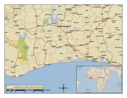 Cette espèce est endémique de l'Afrique australe. Elle se rencontre dans le parc national de Taï en Côte d'Ivoire et dans le Sud-Ouest du Ghana. Elle pourrait être présente au Liberia[1],[2].
