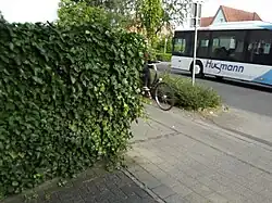 Danger d'accident causé par des plantes grimpantes qui bouchent la vue sur une piste cyclable à Steinfurt, en Allemagne.