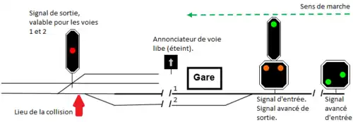 - d'un signal de sortie, situé après l'aiguille reliant les voies 1 et 2 et s'adressant à elles.