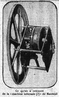 - ↑ Se composant, selon la description donnée dans la presse, « d'une sorte de volant ayant environ 30 centimètres de diamètre et à l'intérieur duquel se trouvent des ailettes. Au-dessus de ce volant est une boîte en fer à roues dentées, avec un axe à ressort. Aux quatre coins de la boîte, d'autres axes maintenus par des petites goupilles. » (Le Gaulois du 11 février 1919, p. 2).