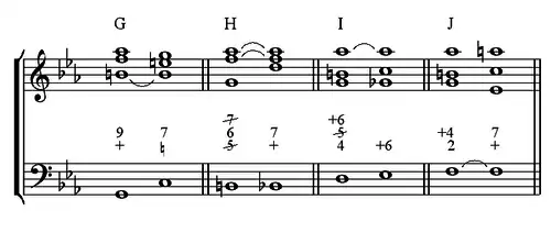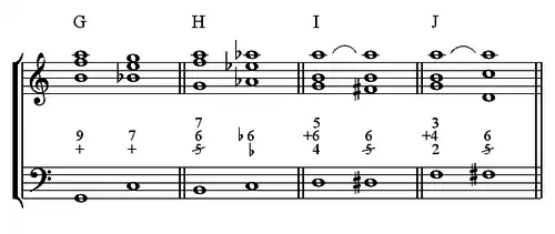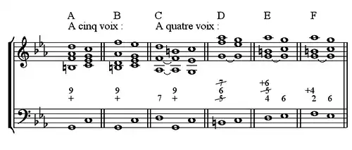 - On note dans ce chiffrage, qu'en vertu de la règle obligeant la neuvième à se trouver au-dessus de la sensible, l'ordre des chiffres représentant les deux notes en question — « +6 » et « 5 » — rappelle la disposition obligatoire.