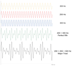 Les trois notes d'un accord parfait majeur correspondent (plus ou moins exactement selon le tempérament utilisé), aux trois harmoniques de rangs 4, 5 et 6 d'une fonction périodique dont la fréquence est située 2 octaves en dessous de la fondamentale du dit accord.
