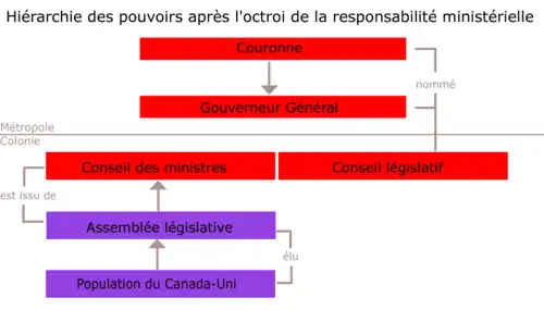 Pour les Canadiens français du territoire maintenant désigné comme Canada-Est, l'Acte d'Union les place en minorité politique. La tentative d'assimilation de la métropole par cette constitution échouera car, dans les deux parties du Canada-Uni, un désir d'autonomie politique rassemblera les députés des deux origines ethniques. Ainsi, l'alliance des partis réformistes du Canada-Est et du Canada-Ouest, conduite par Louis-Hippolyte La Fontaine et Robert Baldwin, sera portée au pouvoir en 1842. Ce gouvernement de coalition fera de nombreuses pressions auprès du Gouverneur «afin qu'il accepte l'idée d'un gouvernement responsable canadien, seule institution capable de faire sortir le Canada de son mode de fonctionnement désuet»[3]. Lord Elgin, nommé Gouverneur général par Londres en 1847, était favorable au gouvernement responsable et travailla en ce sens avec l'alliance réformiste de Lafontaine et Baldwin. Au Royaume-Uni, le gouvernement libéral au pouvoir délaisse le protectionnisme économique en vigueur entre la métropole et ses colonies. En retirant sa protection économique, la métropole doit permettre aux colonies de déterminer elles-mêmes leur politique intérieure[4]. Bref, c'est à cause des pressions politiques internes des réformistes et du contexte économique britannique que le Canada a pu obtenir un gouvernement responsable.