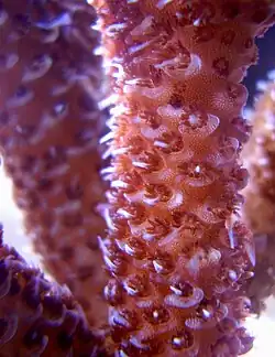 - Groupe d'Acanthaster planci dévorant un Acropora tabulaire en Australie. Cette étoile de mer venimeuse est un des principaux prédateurs du corail.