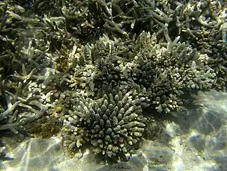Acropora muricata blanchi, mort puis partiellement colonisé par des algues à la Réunion.