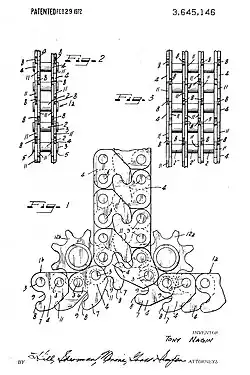 Une première conception de la chaîne utilisée comme colonne télescopique à la place d'un pilon horizontal a été réalisée par Eldridge E. Long, qui a obtenu un brevet américain pour son "Lifting Jack" en 1933, qu'il pensait être "particulièrement adapté à une utilisation sur des automobiles"[6]. Il utilisait une configuration à double chaîne, chaque chaîne reliant des blocs porteurs solides qui étaient empilés pour résister aux charges de compression. En 1951, Yaichi Hayakawa a obtenu un brevet américain pour son "Interlocking Chain Stanchion" qui éliminait les blocs de roulement en intégrant la trajectoire de la force de compression dans les maillons imbriqués de deux chaînes en forme de rouleaux[7]. L'action de fermeture éclair des chaînes imbriquées dos à dos permettait un déplacement de la chaîne sans guide, indépendamment de l'orientation et de la trajectoire.