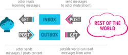 Chaque acteur du réseau, que ce soit un utilisateur, une chaîne de vidéos ou un blog par exemple possède une boîte de réception (« inbox ») et une boîte d'envoi (« outbox »), qui sont des URL[4]. Chaque action (publication d'un message, invitation à un évènement, etc) est représentée par une activité, dont la liste est définie par le standard ActivityStreams.