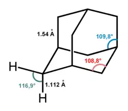 L'adamantane consiste en trois cyclohexanes fusionnés. Ses paramètres moléculaires ont été mesurés par diffraction électronique et cristallographie. La longueur des liaisons carbone-carbone est de 154 pm (1.54 Å) identique à celle dans le diamant et la distance carbone-hydrogène vaut 111,2 pm (1.112 Å)[5].