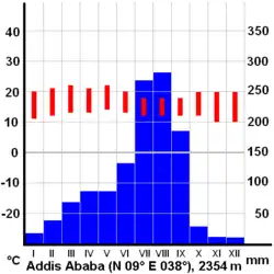 Située dans la zone tropicale sèche, Addis Abeba échappe aux chaudes températures de Djibouti, à l'est, ou du Soudan, à l'ouest, grâce à l'altitude qui permet des températures relativement agréables toute l'année (voir graphique ombro-climatique ci-contre). La principale saison des pluies (krämt) a lieu de juin à septembre, et rend les rues non goudronnées difficilement praticables quoique moins poussiéreuses.
