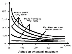 Le coefficient d'adhérence varie également avec la température du rail, ainsi qu'avec la présence de corps s'interposant entre la roue et le rail : les feuilles déjà évoquées, mais aussi l'eau (pluie, humidité ambiante), les huiles et graisses, poussières, …