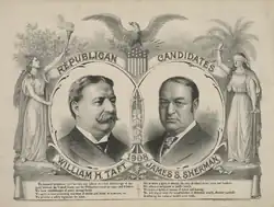 Élu triomphalement à la présidence en 1904, Theodore Roosevelt annonça ne pas vouloir être candidat à l'élection présidentielle de 1908. Celui qu'il considérait comme son successeur naturel, le secrétaire à la Guerre William Howard Taft, était initialement réticent à endosser ce rôle[1], estimant que la fonction de juge en chef de la Cour suprême lui aurait mieux convenu[2]. Roosevelt mobilisa néanmoins la machine du Parti républicain derrière Taft[1] et les fonctionnaires politiques reçurent pour instruction de soutenir la candidature de Taft ou de s'abstenir de tout commentaire[3]. Un certain nombre de républicains influents, tels que le secrétaire au Trésor George B. Cortelyou, songèrent également à se présenter mais s'abstinrent en définitive de participer à la course. D'autres, comme le gouverneur de New York Charles Evans Hughes, sollicitèrent tout de même la nomination de leur parti, mais Roosevelt s'arrangea pour atténuer l'impact de la campagne de Hughes dans la presse[4]. À l'ouverture de la convention nationale républicaine de 1908, qui se déroula en juin à Chicago, Taft n'avait aucun concurrent sérieux et la nomination lui échut dès le premier tour de scrutin. Pour le choix du colistier, le sénateur de l'Iowa Jonathan Dolliver, un progressiste du Midwest, avait la préférence de Taft mais ce fut le représentant de New York James Sherman, un conservateur, qui fut désigné par la convention. Le , Taft démissionna du portefeuille de la Guerre pour se consacrer pleinement à sa campagne[5],[6].