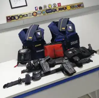 Les fonctionnaires des douanes armés sont équipés de gilets pare-balles (marqués "DOUANE" ou à port discret).