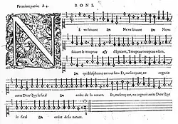 La musique est imprimée d'après la technique initiée à Paris par Pierre Attaingnant (en simple impression, chaque type portant un segment de portée), avec des caractères fondus par les tailleurs Guillaume I Le Bé et Robert Granjon. Le matériel typographique[1] est riche d'une dizaine de caractères de musique, de plain-chant ou de tablature, répartis en trois corps :