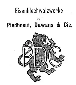 Par la suite, et en parallèle de la clouterie créée à Liège, Adrien Dawans fonde en 1858 avec Jean-Pascal Piedboeuf (père de Jean-Louis Piedboeuf-Dawans, qui repris progressivement toutes ses affaires entre 1863 et 1870), les premiers laminoirs à tôles de Düsseldorf sous le nom de Piedboeuf, Dawans et Cie. La marque de fabrique de ces laminoirs portait un lion accompagné des initiales P.D.C. Le lion était un symbole héraldique représentant les origines belges des fondateurs de la société. Afin de mieux servir les intérêts des laminoirs, la société Dawans, Orban et Cie étendra ses activités à Düsseldorf en 1859. Allié aux familles Piedboeuf, Orban et Chaudoir, Adrien Dawans contribua fortement au développement de l'industrie sidérurgique allemande et belge[10],[11].
