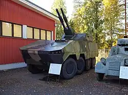 - ↑ (sv) « Försvarsmakten beställer 40 stycken AMOS-liknande granatkastarpansarbandvagnar », sur ornucopia.cornubot.se, (consulté le ).