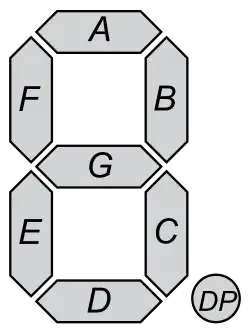 Les segments sont désignés par les lettres A à G. Le point décimal optionnel (un huitième segment, appelé DP) est utilisé pour l'affichage des nombres non entiers[2],[3]. Un seul octet peut coder l'état complet d'un affichage à 7 segments, y compris le point décimal. Les codages de bits les plus populaires sont gfedcba et abcdefg. Dans la représentation gfedcba, une valeur d'octet de 0x06 active les segments 'c' et 'b', qui afficheraient un '1'.