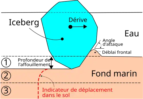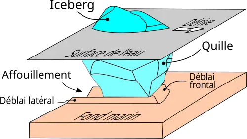 Lorsqu’une formation de glace flottante (typiquement un iceberg ou un fragment de banquise) dérive dans une zone peu profonde, il arrive que la partie immergée (la quille) de cette glace touche le fond de l’eau. Elle se met alors à racler les sédiments en y laissant un sillon[1] – c’est le phénomène de l’affouillement (Wadhams 2000, Weeks 2010, ch. 13). Si ce phénomène est le plus souvent observé dans les mers et les océans, on le remarque également dans les rivières et les lacs (Noble and Comfort 1982, Grass 1984).