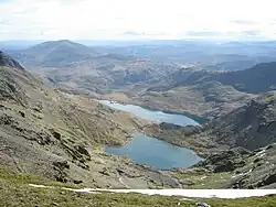Vus du sommet du mont Snowdon, le Llyn Glaslyn, source de la rivière du même nom, et le Llyn Llydaw situé au fond, en contrebas.