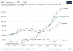 L'égalité des revenus entre les différents groupes de populations n'a pas progressé depuis la fin de l'apartheid et l'Afrique du Sud connaît un taux d'inégalité parmi les plus élevés au monde[7]. C'est toutefois une puissance de référence pour le continent africain[7] avec l'une des économies les plus développées du continent et des infrastructures modernes couvrant tout le pays. C'est la deuxième puissance économique d'Afrique derrière le Nigeria[8],[9]. Le pays se caractérise aussi par une importante population de souche européenne (Afrikaners, Anglo-sud-africains) et par d'importantes richesses minières (or, diamant, charbon, etc.) qui en ont fait un allié indispensable des pays occidentaux durant la guerre froide.