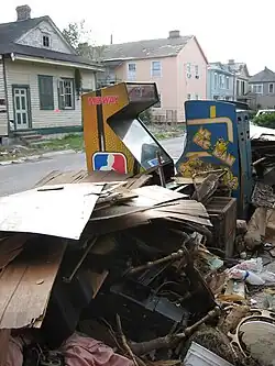 Vestige de bornes d'arcade des jeux NBA Jam à gauche et Ms. Pac-Man à droite, qui ont survécu à l'ouragan Katrina qui a dévasté l'Est des États-Unis en 2005.