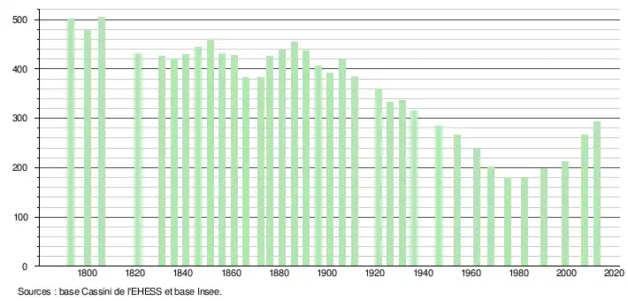 L'évolution du nombre d'habitants est connue à travers les recensements de la population effectués dans la commune depuis 1793. À partir du , les populations légales des communes sont publiées annuellement dans le cadre d'un recensement qui repose désormais sur une collecte d'information annuelle, concernant successivement tous les territoires communaux au cours d'une période de cinq ans. Pour les communes de moins de 10 000 habitants, une enquête de recensement portant sur toute la population est réalisée tous les cinq ans, les populations légales des années intermédiaires étant quant à elles estimées par interpolation ou extrapolation[17]. Pour la commune, le premier recensement exhaustif entrant dans le cadre du nouveau dispositif a été réalisé en 2007[18],[Note 1].
