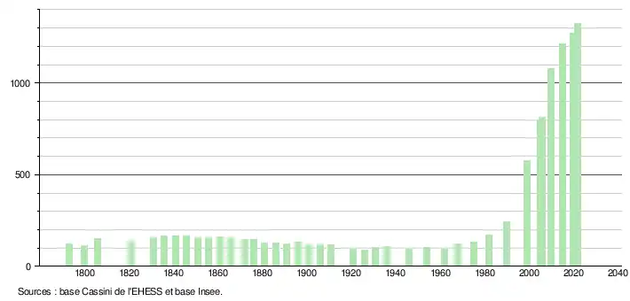 L'évolution du nombre d'habitants est connue à travers les recensements de la population effectués dans la commune depuis 1793. Pour les communes de moins de 10 000 habitants, une enquête de recensement portant sur toute la population est réalisée tous les cinq ans, les populations de référence des années intermédiaires étant quant à elles estimées par interpolation ou extrapolation[26]. Pour la commune, le premier recensement exhaustif entrant dans le cadre du nouveau dispositif a été réalisé en 2005[27].