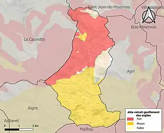 Le retrait-gonflement des sols argileux est susceptible d'engendrer des dommages importants aux bâtiments en cas d’alternance de périodes de sécheresse et de pluie. 89,3 % de la superficie communale est en aléa moyen ou fort (59,3 % au niveau départemental et 48,5 % au niveau national). Sur les 352 bâtiments dénombrés sur la commune en 2019, 350 sont en aléa moyen ou fort, soit 99 %, à comparer aux 85 % au niveau départemental et 54 % au niveau national. Une cartographie de l'exposition du territoire national au retrait gonflement des sols argileux est disponible sur le site du BRGM[25],[Carte 2].