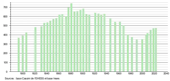 En 2022, la commune comptait 472 habitants[Note 5], en évolution de +0,85 % par rapport à 2016 (Hérault : +7,49 %, France hors Mayotte : +2,11 %).