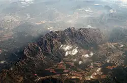 Vue aérienne du massif de Montserrat où les familles verticales de diaclases entre les aiguilles sont bien visibles.