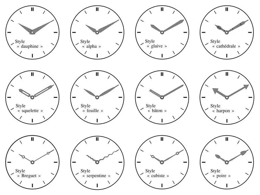 Il existe une immense variété de style dans le dessin des aiguilles d'horlogerie. La figure ci-dessous représente les grandes familles esthétiques les plus connues[3],[4] :